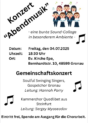 Freitag, 04.07.2025: Konzert „Abendmusik“, evangelischen Kirche Gronau-Epe